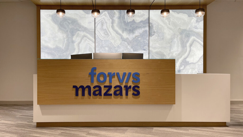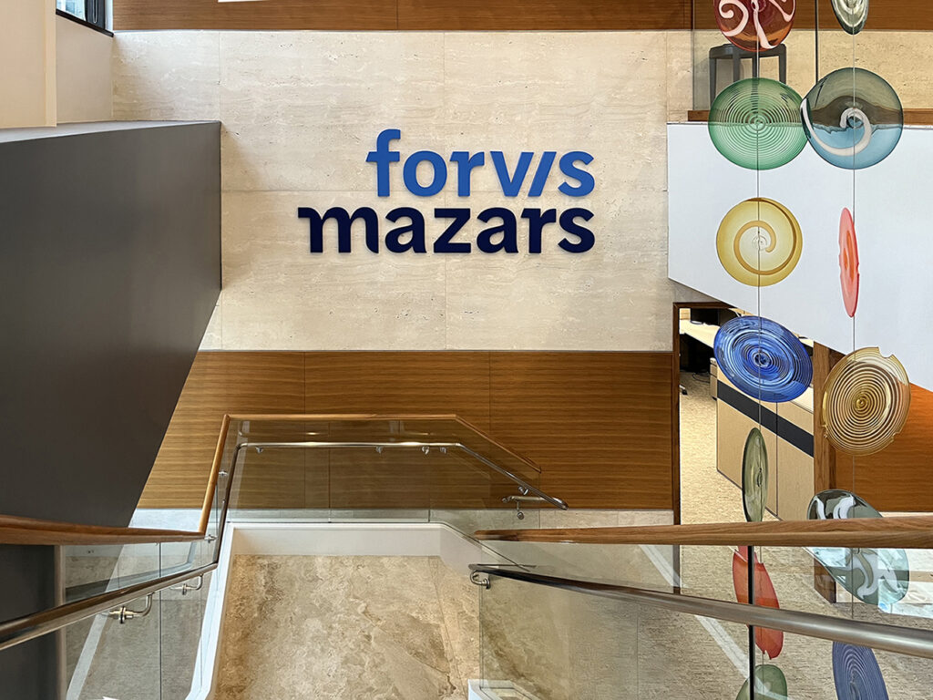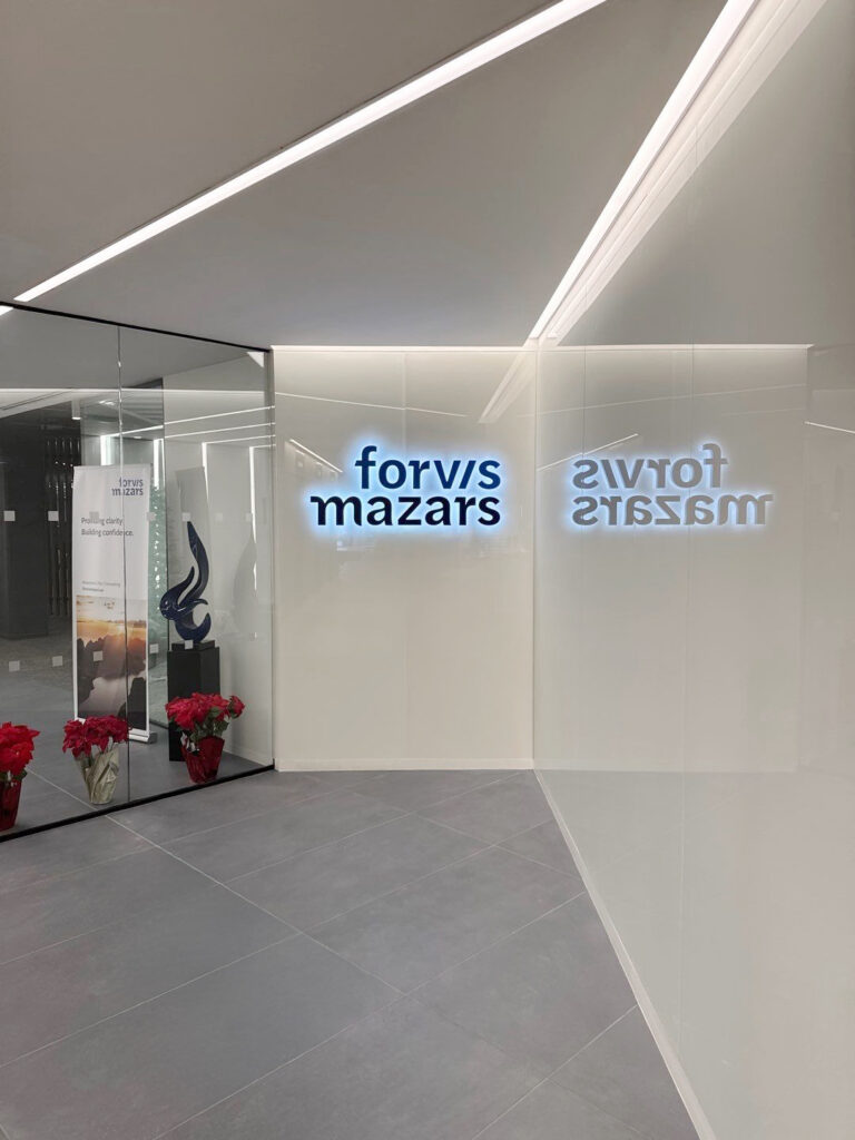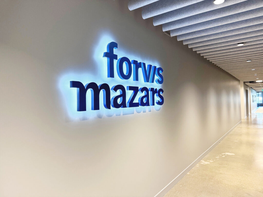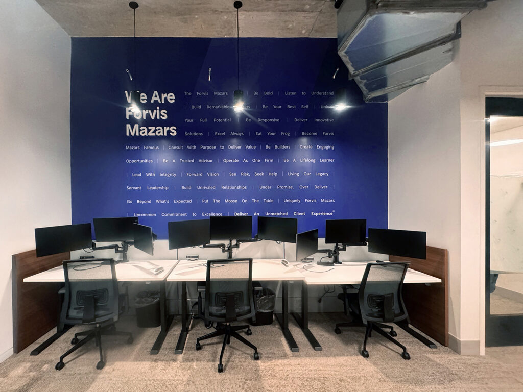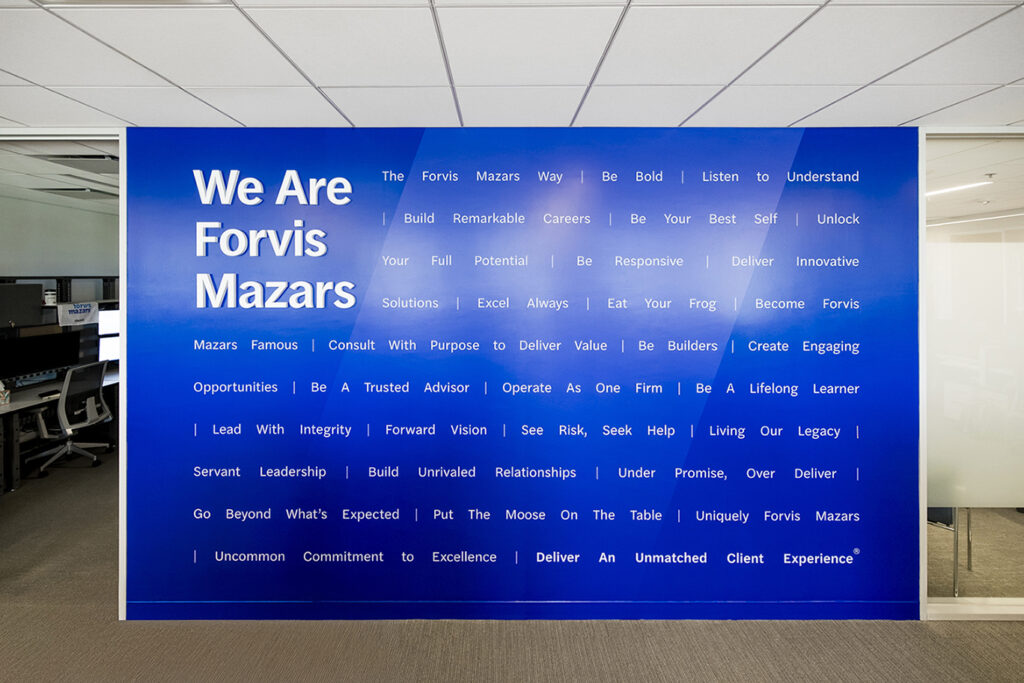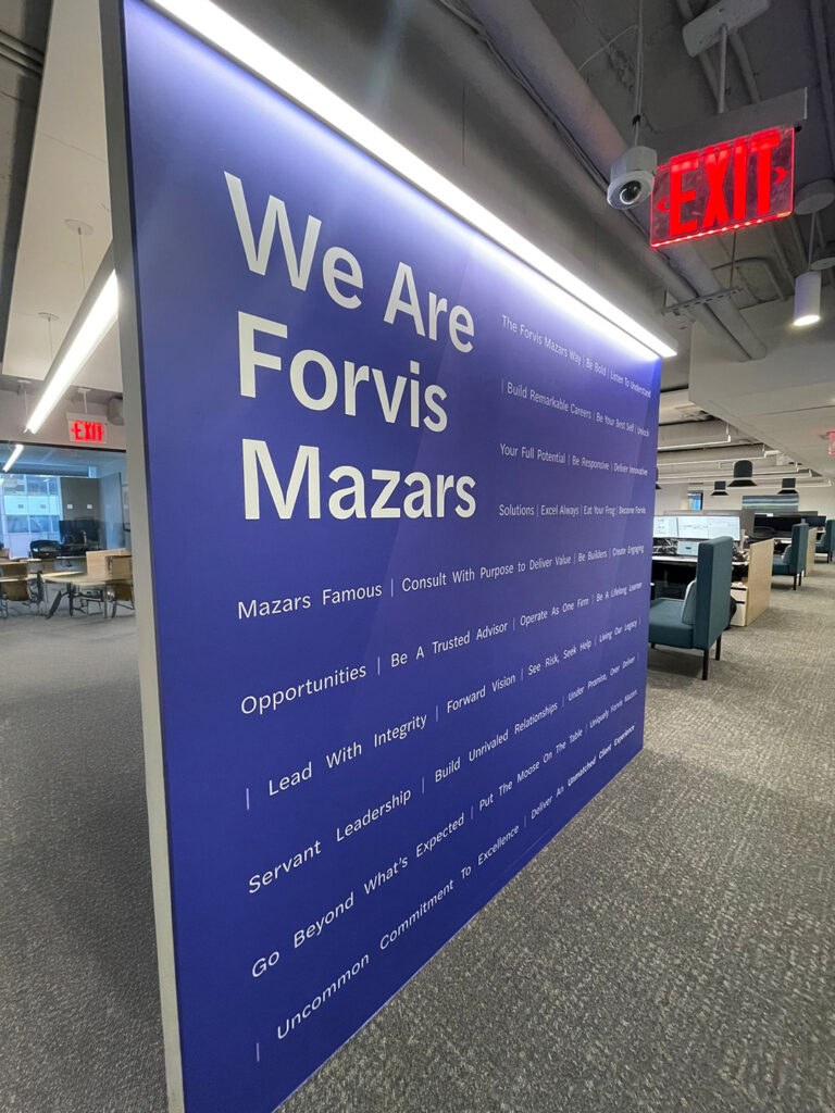 The Sign Factory is privileged to have contributed in bringing Forvis Mazars’ forward-thinking vision to life through their comprehensive signage rebrand. Our team takes immense pride in successfully completing a significant undertaking, managing over 60 projects across 27 states within a span of 9 months. From exterior building and monument signs to illuminated lobby signs, frosted privacy banding, and inspiring mission statement designs, The Sign Factory ensured every detail was executed with precision and care. This extensive project not only demonstrated our team’s capability and efficiency but also reinforced Forvis Mazars’ brand identity and their unwavering commitment to delivering an exceptional client experience on a national scale.